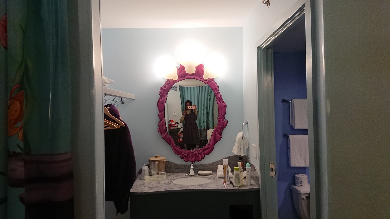 他的洗臉化妝區有夠大的,還有布簾可以拉喔!!! 如果朋友需要換衣服可以用他來隔開兩區(姆指